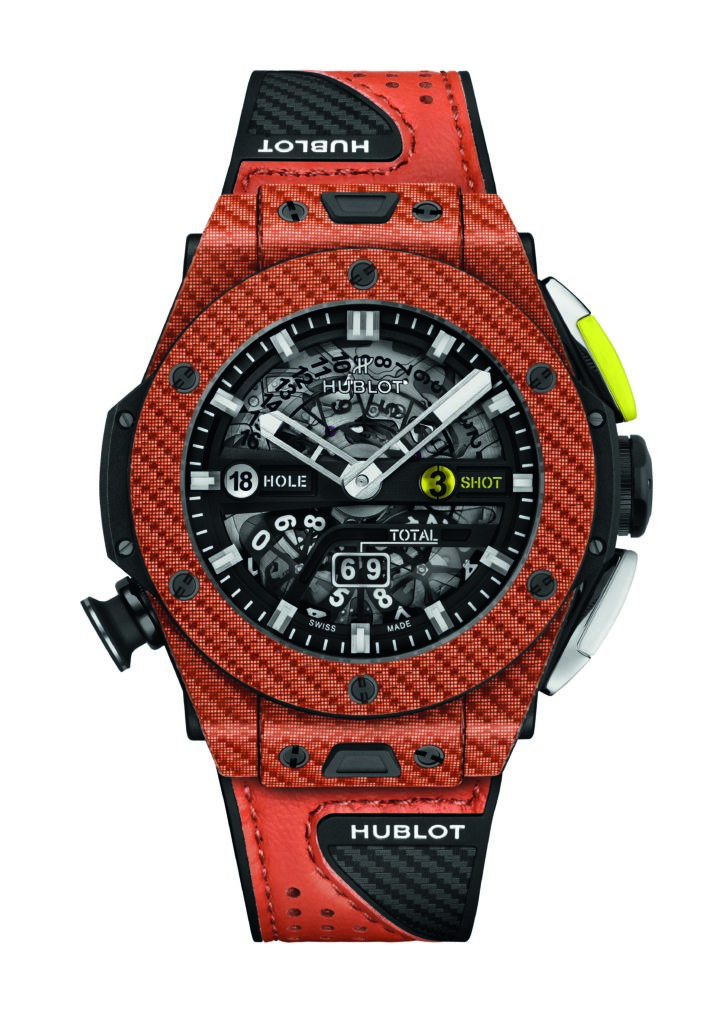 Полностью механические и безукоризненно функциональные часы для игрока в гольф? Такое мог создать только швейцарский бренд Hublot. Для часов Big Bang Unico Golf Orange Carbon часовщиками бренда был разработан специализированный, очень сложный калибр Unico HUB1580, позволяющий игроку вести счёт очков на всём продолжении игры. Это мануфактурный механизм, то есть разработанный и произведённый самим брендом. Он оснащается системой автоматического завода и обеспечивает солидный 70-часовой запас хода. Сложный блок гольф-индикации позволяет игроку нажатиями кнопок отмечать все свои удары, переходы с лунки на лунку, а хитроумный механизм сам подсчитывает набранные (скорее, потерянные – такова специфика этой игры) очки.