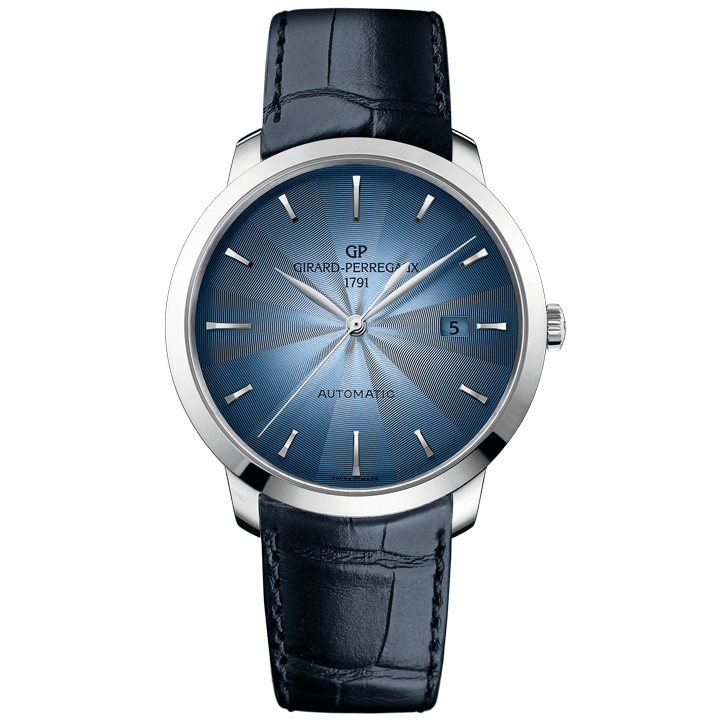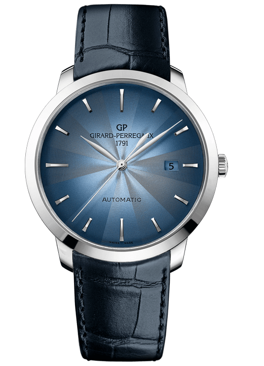 Классика от Girard-Perregaux с традиционной высококлассной отделкой рельефным декором «гольоше» с мотивом «лотос» и актуальной «дымчатой» отделкой с плавным переходом окраски от светлой в центре к более тёмной по краям. Благодаря тонкому корпусу (8,9 мм) и спокойной серой окраске циферблата эти часы превосходно подойдут классическому костюму и формальному стилю.