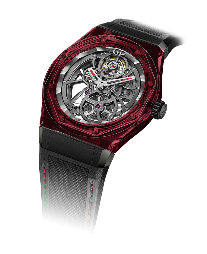 Начало 2023 года в коллекции швейцарского бренда Girard-Perregaux было отмечено появлением двух цветных вариантов часов Laureato Absolute Light с прозрачными кристаллическими корпусами. В модели Laureato Absolute Light & Shade преобладают серые оттенки, тогда как в часах Laureato Absolute Light & Fire появляется очень интересный бордовый тон, напоминающий цвет превосходного старого вина. Эта ассоциация придаёт часам особенно привлекательный характер, так как кристаллический корпус часов Laureato Absolute Light & Fire прозрачен – как вино, налитое в бокал.