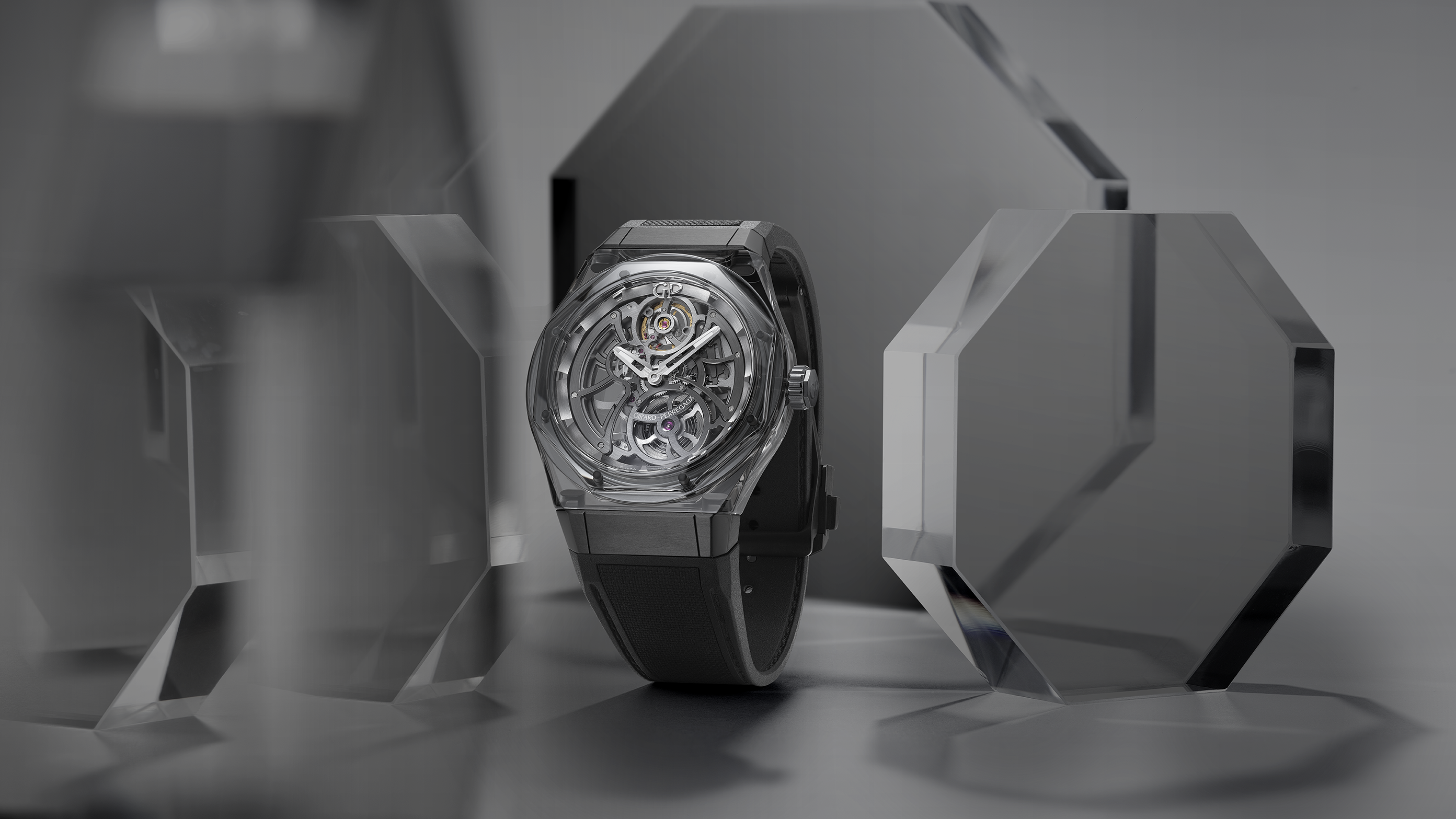 Привлекательный и загадочный дизайн новых часов Laureato Absolute Light & Shade швейцарского бренда Girard-Perregaux появился благодаря уникальной технике, впервые опробованной часовщиками бренда именно в этой модели. Тысячи оттенков серого, возникающие благодаря игре света и тени на гранях прозрачного сапфирового корпуса, создаются металлизацией сапфировых компонентов корпуса. Серые металлические тона также преобладают в отделке внешнего кольца циферблата и скелетонизированный автоматического калибра.