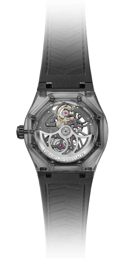 Лучшая опция, которую только можно придумать для часов с прозрачным корпусом из синтетического сапфира, – это высококлассный скелетонизированный калибр. Часовщики Girard-Perregaux предлагают именно такой вариант – калибр GP01800-1143, один из лучших современных скелетонизированный механизмов с автоматическим заводом. Дизайн продуман до мельчайшей детали. Отделка превосходна, и удовлетворит требованиям знатоков и перфекционистов. Серые металлические тона, преобладающие в отделке механизма, безупречно сочетаются с прозрачным сапфировым корпусом загадочного дымчато-серого оттенка.