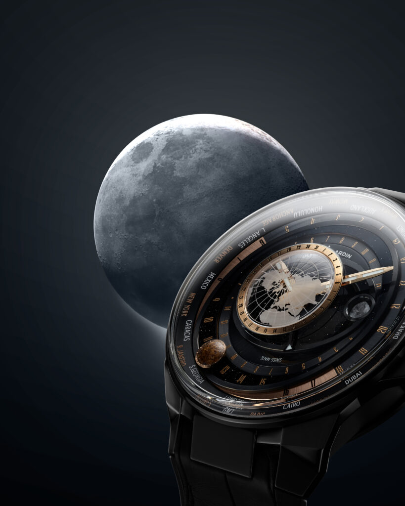 Эта модель выполнена в строгой, но импозантной чёрно-бронзовой гамме, которая моментально внушает уважение к этим часам. Blast Moonstruck 45mm похожи на старинный астрономический инструмент, коим, по сути, они и являются. Представьте, у вас на руке механическое устройство, показывающее в каждый момент времени взаимное расположение Солнца, Земли и Луны относительно того места на Земле, где в данный момент находится владелец часов – или где он хотел бы оказаться…
